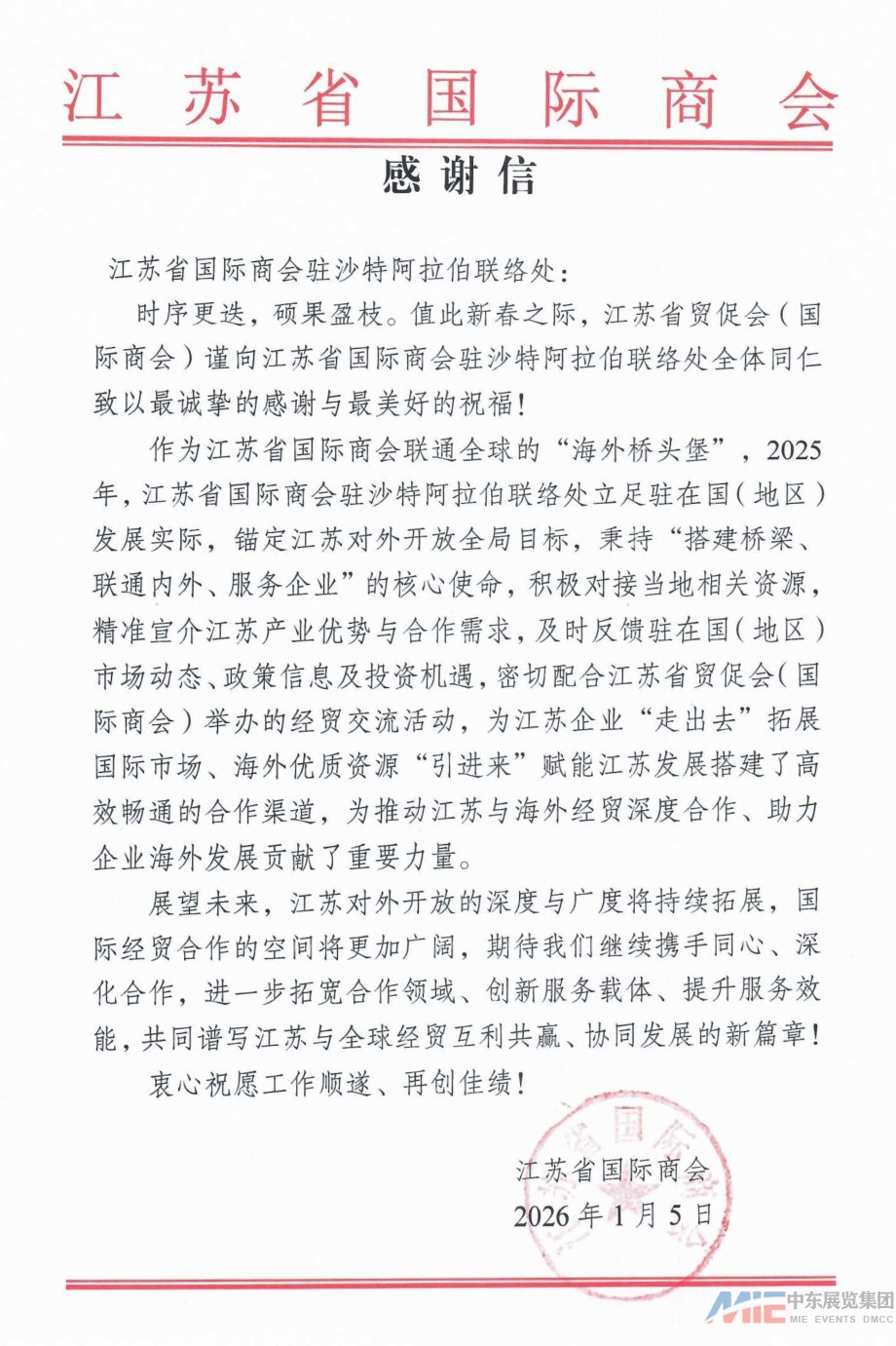 新年伊始,一封来自江苏省贸促会(国际商会)的感谢信,为MIE集团沙特联络处带来了暖意与鼓舞。信中的认可,既是对过去一年工作的最好总结,也是对团队十余年来扎根沙特、默默耕耘的回响。