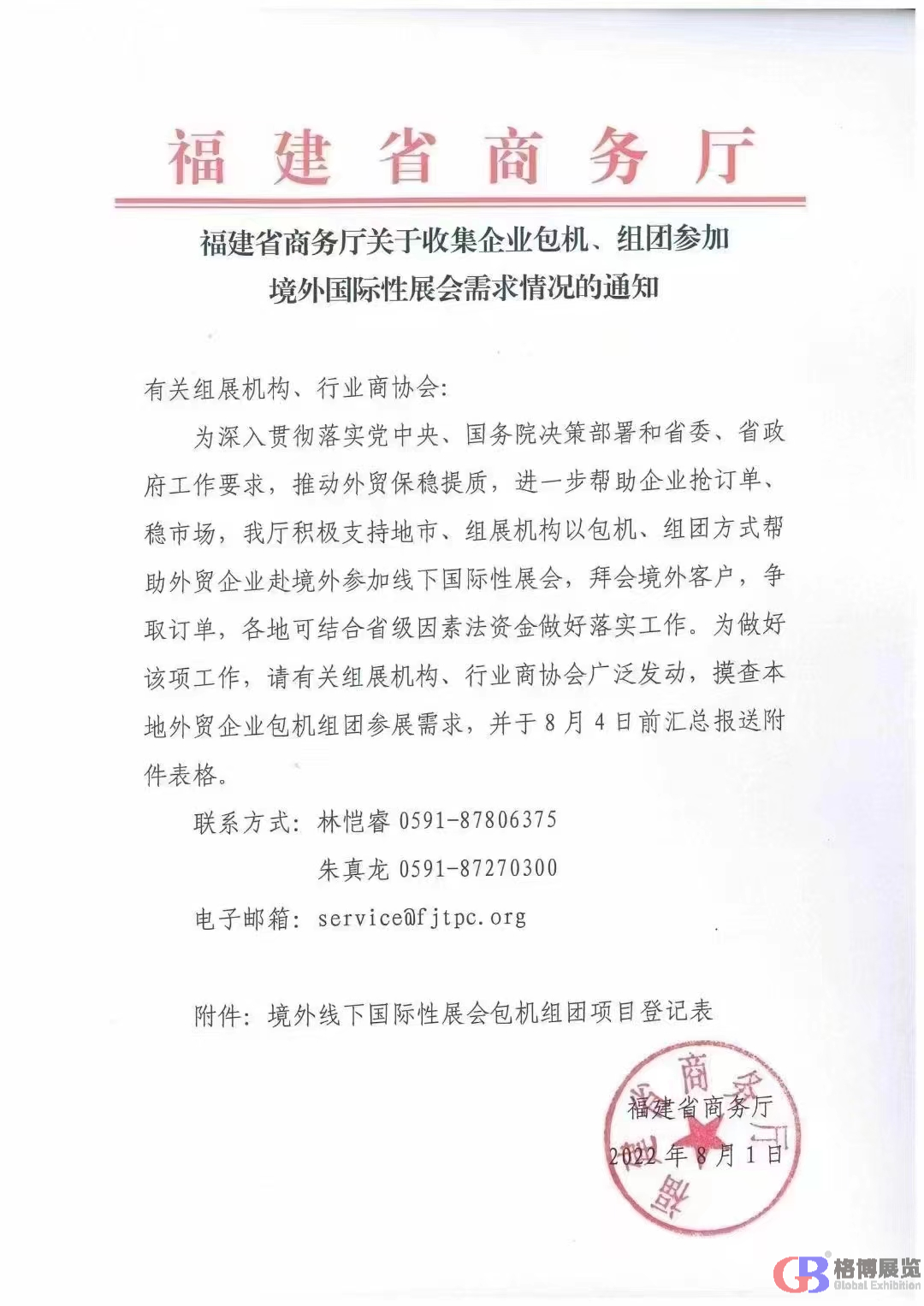 《福建省商务厅关于收集企业包机、组团参加境外国际性展会需求情况的通知》