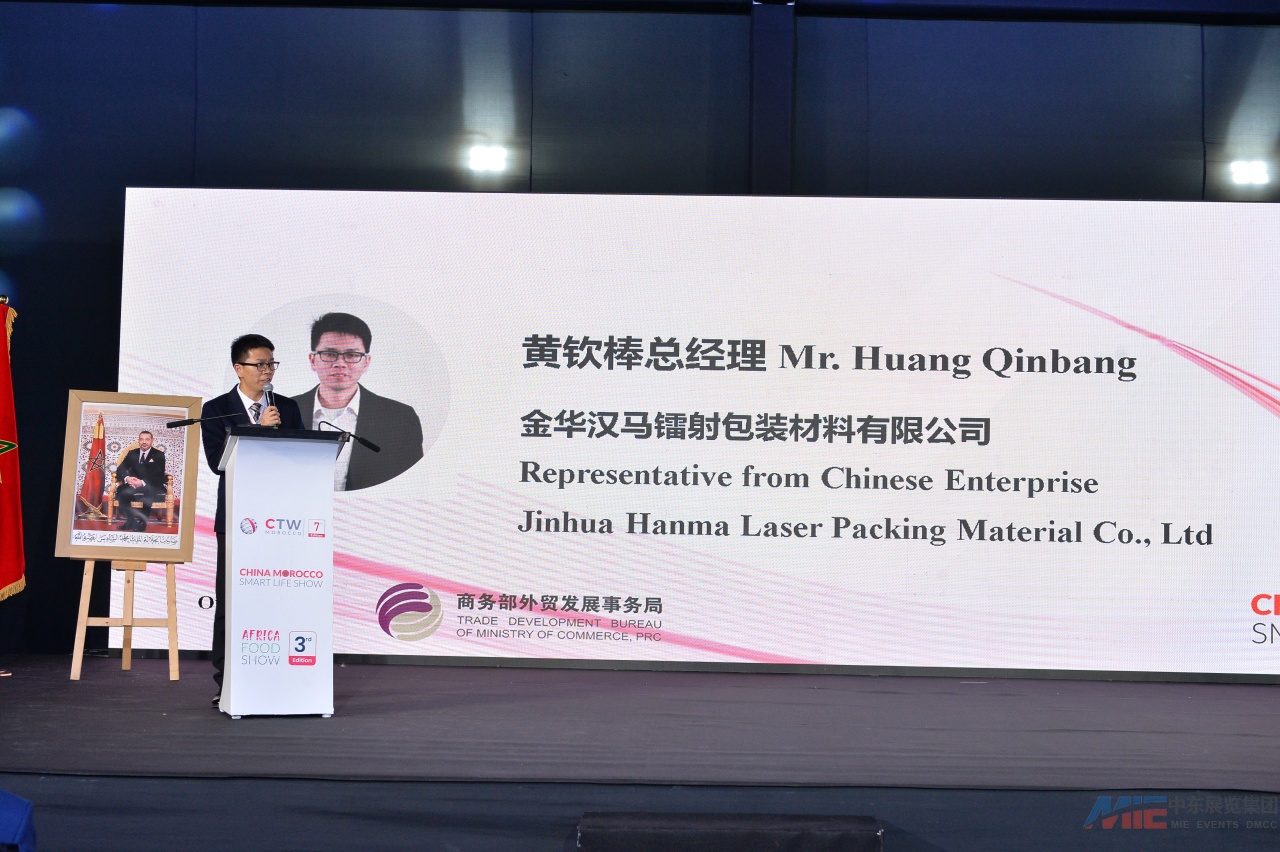 展会首日下午举办的“中国-摩洛哥供应链合作对接会”成为本次活动亮点。这场高规格会议汇聚了中摩两国政策制定者、行业领袖和企业代表,包括中国商务部对外贸易司副司长孟岳、联合国粮农组织顾问Yacine Alaoui、卡萨布兰卡塞塔特工商会国际委员会主席Ali Bouftass和金华汉马镭射包装材料有限公司总经理黄钦棒等重量级嘉宾。